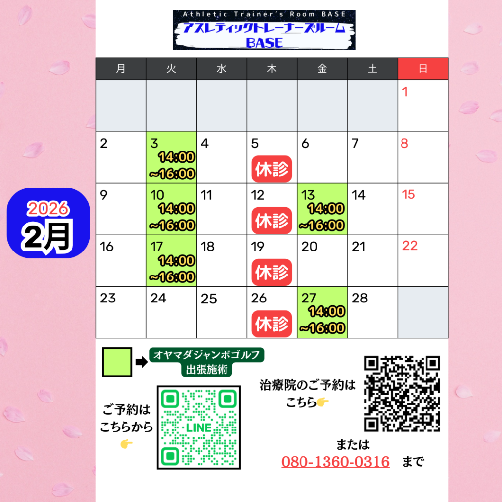 こんにちは! です! 2月の診療の日程についてお知らせいたします! 2/ 5 , 12 , 19 , 26は定休日のため終日休診 とさせていただきます また 2 / 3(火), 10(火), 13(金), 17(火), 27(金)14:00~16:00 オヤマダジャンボゴルフ さま 2F岩手県盛... -
